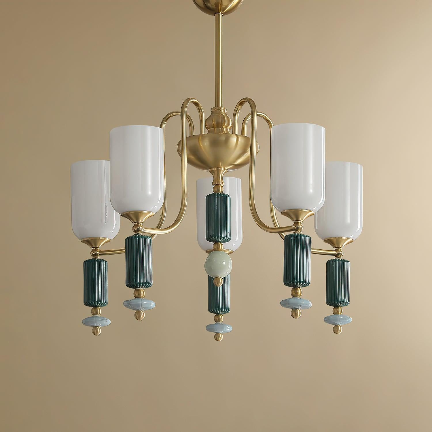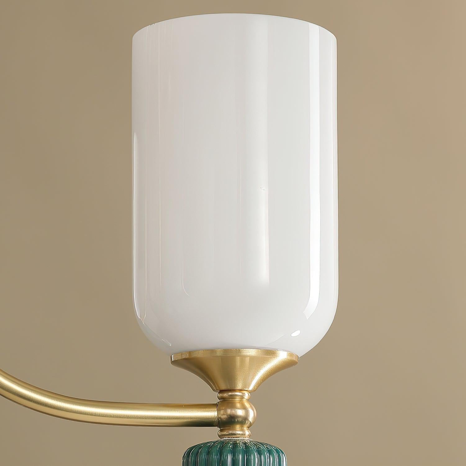| Appearance | Graceful arms (central column), cylindrical glass shades, ceramic elements (fluted/smooth spherical accents), gold & green metal frame |
